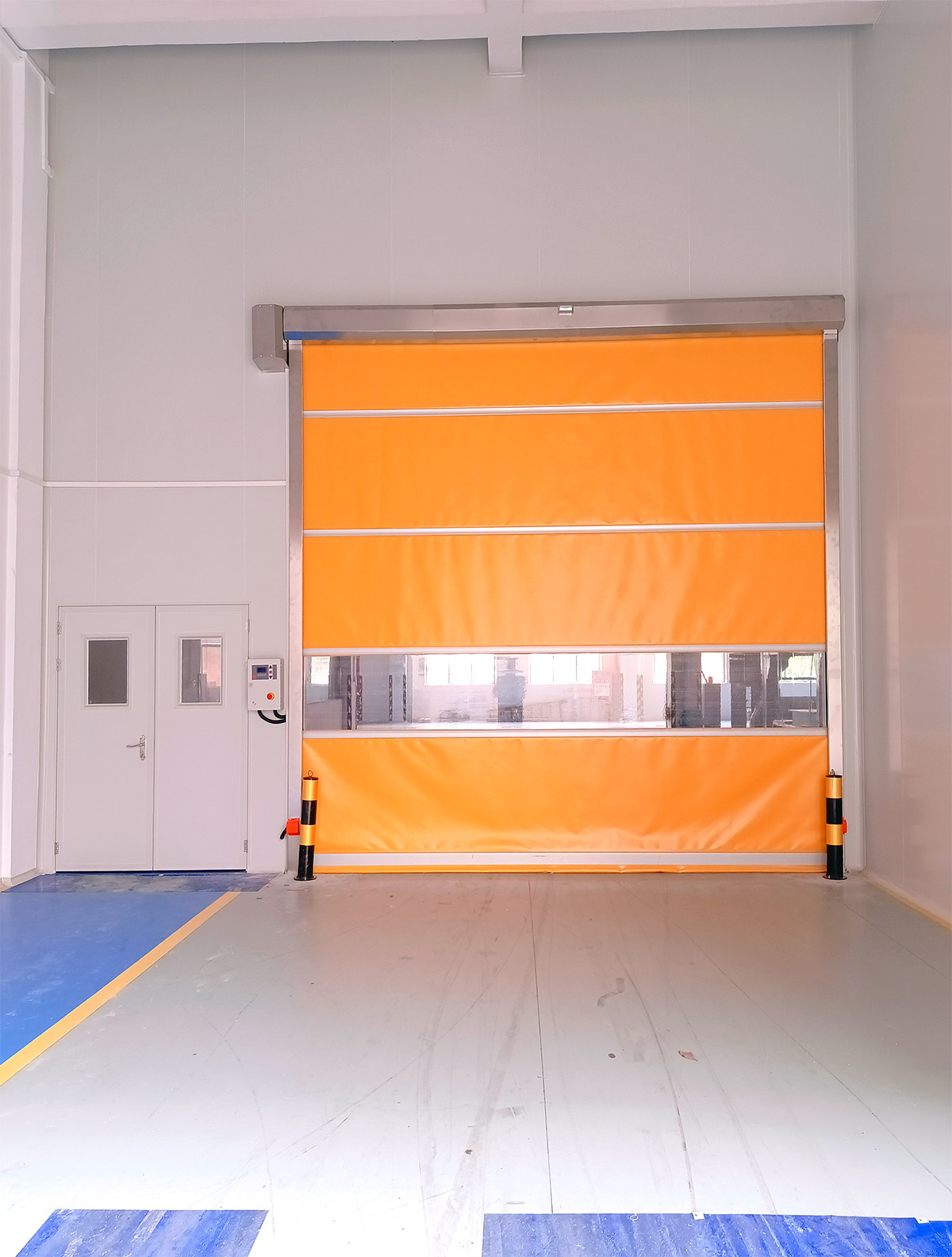 选用法国进口高强度工业织布,厚度为0.9mm,颜色:红色、黄色、蓝色、绿色、橘黄色、灰色、白色、黄色网格、白色网格等多种颜色可选择,中间加装透明视窗(厚1.2mm)使人员车辆出入更安全,具有高抗拉强度, 高抗穿刺性能,适用于频繁开启,高速运转;外置铝合金肋条,增加抗风效果。